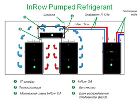 InRow RA Pumped Refrigerant - предельно приближенная к источникам тепла система охлаждения с активной циркуляцией хладагента для средних и крупных центров обработки данных, применяются совместно с компрессорно-конденсационным блоком (до 27 кВт).