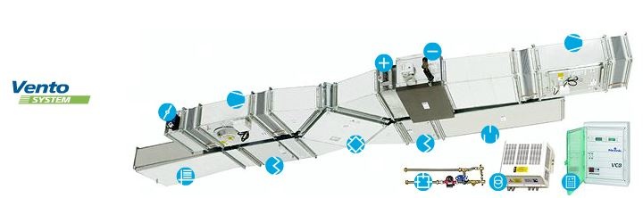 Установки Vento стандартно содержат следующие компоненты: радиальные канальные вентиляторы RP и RQ; крышные вентиляторы RS; шумоизолированные вентиляторы RPH; взрывозащищенные радиальные канальные вентиляторы RP Ex и RQ Ex, карманные и кассетные фильтры воздуха, отсекающие и регулирующие заслонки ручные LKR; отсекающие заслонки с сервоприводом LKS, LKSF, LKSX; смесительные камеры; водяные обогреватели VO; электрические обогреватели EO, EOS, EOSX; прямые испарители CHF; водяные охладители CHV; кулисные шумоглушители TKU; пластинчатые рекуператоры HRV.