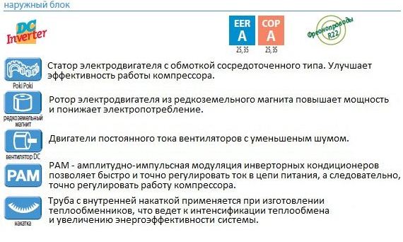 Для уменьшения электропотребления во внутренние и наружные блоки кондиционеров устанавливаются высокоэффективные бесконтактные двигатели постоянного тока для привода вентиляторов. Ротор такого двигателя имеет внешний постоянный магнит, расположенный на поверхности ротора. Эти двигатели обладают повышенным крутящим моментом на малых оборотах, что позволило снизить скорость вращения вентиляторов и уменьшить шум от внутреннего и наружного блоков.