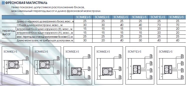 К внешнему блоку Mitsubishi Heavy SCM45ZJ-S можно подключать не более двух внутренних блоков, при этом суммарная длинна магистрали хладагента может составлять до 70 м, что расширяет возможности применения данного блока.