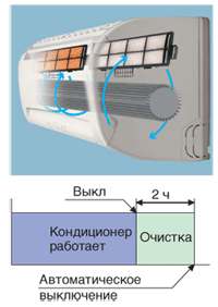 Функция самоочистки активизируется после выключения кондиционера и работает в течение 2 часов. Внутреннее пространство кондиционера высушивается прокачиваемым воздухом, что останавливает рост плесени. Пользователь указывает, включать данную функцию или нет.