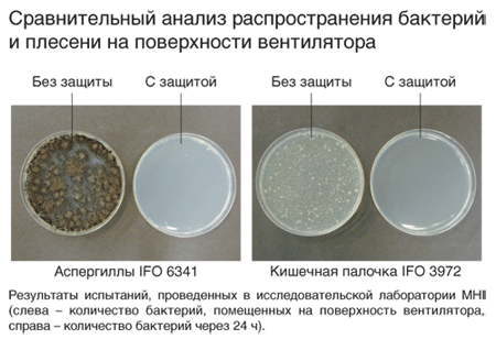 Вентилятор прошел антибактериальную обработку, в результате вещества содержащиеся в вентиляторе, уничтожают плесень и бактерии, делая воздух поступающий в помещение чистым и здоровым.