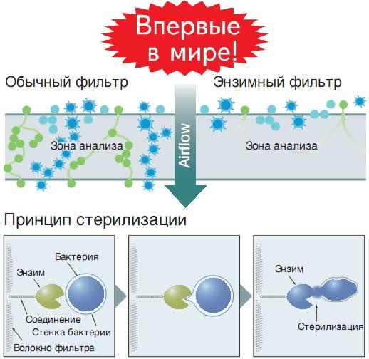 Энзимный фильтр уничтожает бактерии, клещей и другие вещества, способные вызывать аллергическую реакцию. В основе его действия лежит действие литических энзимов природного происхождения. Литические энзимы атакуют стенки микроорганизмов, попадающих на фильтр, и разрушают их. Таким образом, значительно уменьшается количество плесени и бактерий. Природные энзимы очищают и стерилизуют воздух; в результате из кондиционера выходит чистый и безопасный воздух. Даже если бактерия или аллерген попадают после фильтра в воздух, они уже полностью обезврежены.