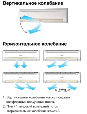 Объемный поток, достигающий всех углов помещения, образуется при поочередном горизонтальном и вертикальном колебании жалюзи. Данный режим запускается с пульта управления.