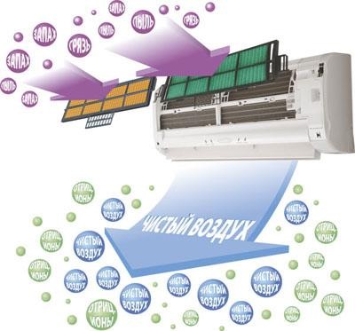 В корпусе кондиционера установлена пластина с турмалиновым покрытием, которая имеет дезодорирующие, стерилизующие свойства, а также способна излучать в ИК дальней области спектра. Отрицательные ионы генерируются постоянно. Даже если кондиционер выключен, он генерирует количество отрицательных ионов, равное концентрации ионов в лесном или морском воздухе.