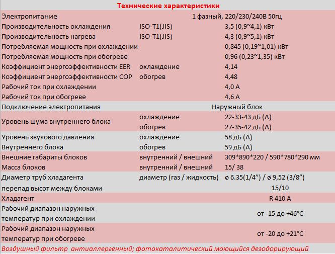 Работа в режиме охлаждения до -15°С, в режиме обогрева до -20°С.