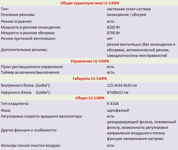 Современная настенная сплит-система LG S30PK радует элегантным дизайном и функциональными параметрами. Комфортный микроклимат важная часть любого помещения. Кондиционер LG S30PK отличается высоким качеством, бесшумностью и долговечностью. Наличие трех скоростей вентилятора и возможность регулировать направление воздушного потока позволит не допускать сквозняков, равномерно распределять воздух по всему объему и обеспечит комфорт в любое время года. Дезодорирующий и плазменный фильтр осуществляют эффективную борьбу с пылью, вирусами и микроорганизмами. Наличие функции запоминания настроек избавит от постоянного выставления одних и тех же параметров. LG S30PK способен работать в широком диапазоне уличных температур.